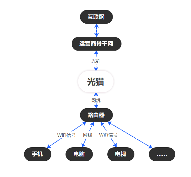 虽然光猫也可以产生WiFi信号,但是由于不是每家都会光纤入户,以及碍于光猫狗屎感人的性能,绝大多数家庭的网络链路应该是这样的: