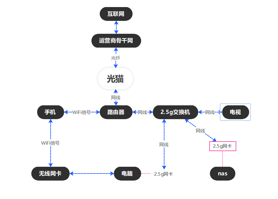 像我在升级前电脑和nas都只有千兆网口,所以咸鱼上捡漏了36俩的2.5g网卡,路由器只有一个2.5g网口,所以90多买了一个2.5g交换机,确认了埋在墙里的网线是超五类后又买了几根六类网线用来链接墙上的网口与电脑,200是绰绰有余的,为了方便理解,这是升级前后的对比图: